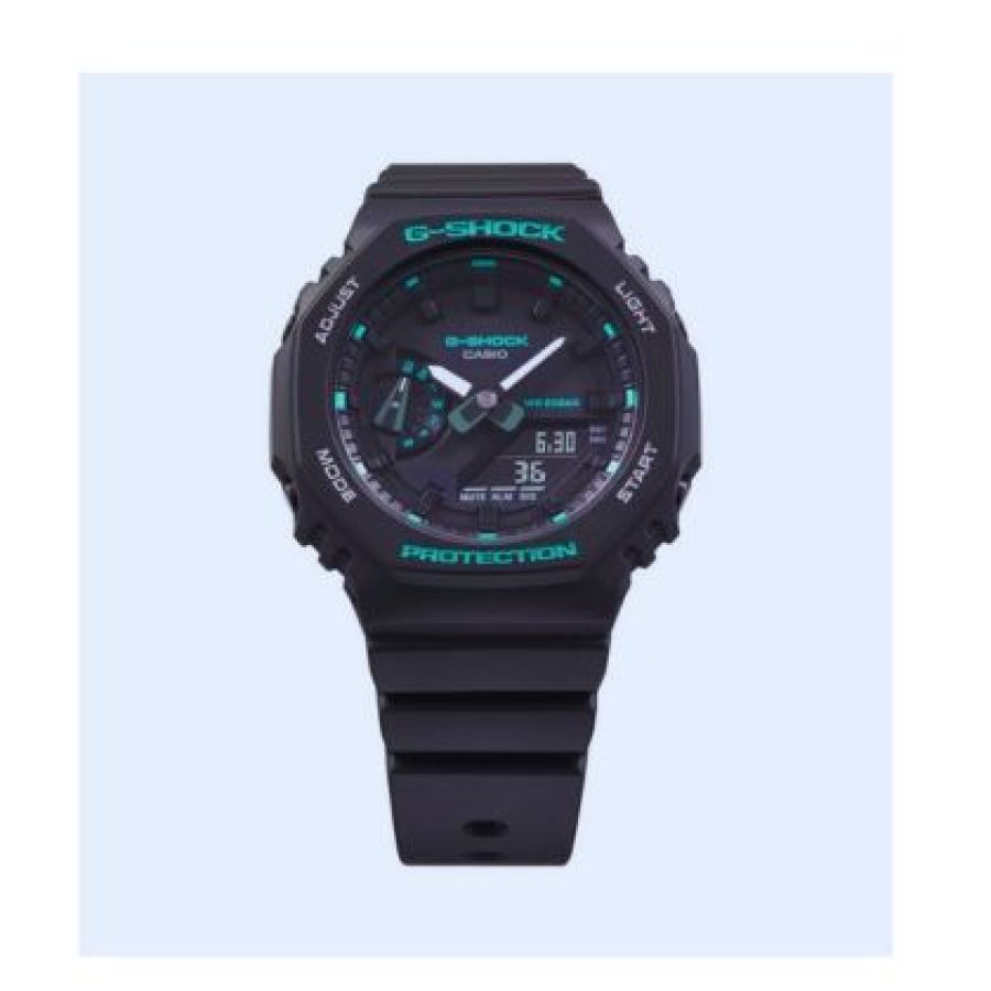 มีสไตล์และสวมใส่สบายด้วย GMA-S2100 ระบบอนาล็อก-ดิจิตอลที่บางและกะทัดรัดกว่า ซึ่งมาพร้อมกับสีเขียวที่ดูทันสมัย หน้าปัดแบบเรียบและตัวบอกเวลาแบบบาร์รวมอยู่ด้วยกันในดีไซน์ที่เพรียวบางและน่าพึงพอใจ สีเขียวดั้งเดิมแบบใหม่สำหรับรายละเอียดต่างๆ อย่างโลโก้ ตัวบอกเวลา และ LCD ทำให้นาฬิการุ่นนี้เป็นเครื่องประดับแฟชั่นแนวสตรีทที่สมบูรณ์แบบ